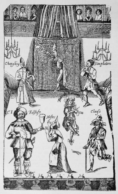 Сцена с персонажами из пьес английских драматургов эпохи Возрождения. На переднем плане Фальстаф и г-жа Куикли. Гравюра на титульном листе сборника пьес “Шутники”. 1662 год.