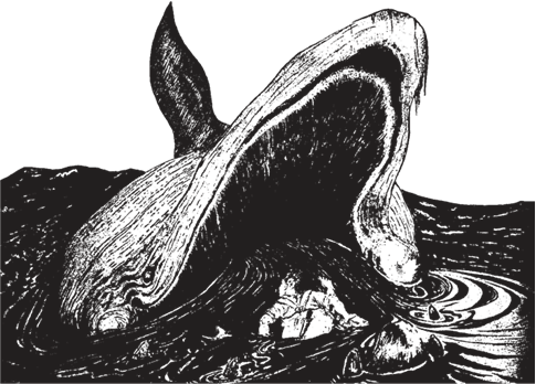 Then the Whale opened his mouth back and back and back till it nearly touched his tail, and he swallowed the shipwrecked Mariner, and the raft he was sitting on, and his blue canvas breeches, and the suspenders (which you must not forget), and the jack-knife. He swallowed them all down into his warm, dark, inside cupboards, and then he smacked his lips – so, and turned round three times on his tail.