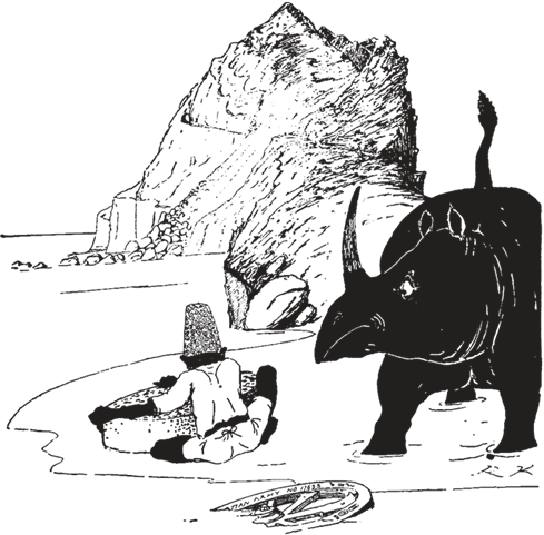 Once upon a time, on an uninhabited island on the shores of the Red Sea, there lived a Parsee from whose hat the rays of the sun were reflected in more-than-oriental splendour[43]. And the Parsee lived by the Red Sea with nothing but his hat and his knife and a cooking-stove of the kind that you must particularly never touch. And one day he took flour and water and currants and plums and sugar and things, and made himself one cake which was two feet across and three feet thick[44]. It was indeed a Superior Comestible (that’s Magic), and he put it on the stove because he was allowed to cook on that stove, and he baked it and he baked it till it was all done brown and smelt most sentimental[45]. But just as he was going to eat it there came down to the beach from the Altogether Uninhabited Interior one Rhinoceros with a horn on his nose, two piggy eyes, and few manners[46]. In those days the Rhinoceros’s skin fitted him quite tight[47]. There were no wrinkles in it anywhere. He looked exactly like[48] a Hoah’s Ark Rhinoceros, but of course much bigger. All the same, he had no manners then, and he has no manners now, and he never will have any manners. He said, ‘How!’ and the Parsee left that cake and climbed to the top of palm-tree with nothing on but his hat, from which the rays of the sun were always reflected in more-than-oriental splendour. And the Rhinoceros upset the oil-stove with his nose, and the cake rolled on the sand, and he spiked that cake on the horn of his nose, and he ate it, and he went away, waving his tail, to the desolate and Exclusively Uninhabited Interior which abuts on the islands of Mazanderan, Socotra, and the Promontories of the Larger Equinox[51]. Then the Parsee came down from his palm-tree and put the stove on its legs and recited the following Sloka, which, as you have not heard, I will now proceed to relate: —