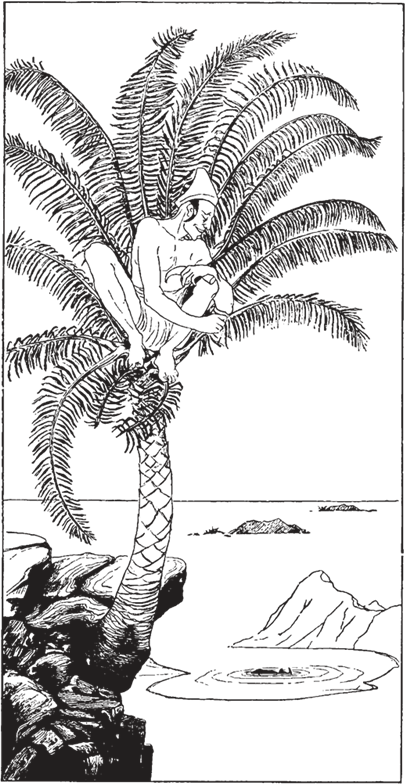 This is the Parsee Pestonjee Bomonjee sitting in his palm-tree and watching the Rhinoceros Strorks bathing near the beach of the Altogether Uninhabited Island after Strorks had taken off his skin. The Parsee has rubbed the cake-crumbs into the skin, and he is smiling to think how they will tickle Strorks when Srorks puts it on again. The skin is just under the rocks below the palm-tree in a cool place; that is why you can’t see it. The Parsee is wearing a new more-than-oriental-splendour hat of the sort that Parsees wear; and he has a knife in his hand to cut his name on palm-tree. The black things on the islands out at sea are bits of ships that got wrecked going down the Red Sea; but all the passengers were saved and went home. The black thing in the water close to the shore is not a wreck at all. It is Strorks the Rhinoceros bathing without his skin. He was just as black underneath[56] his skin as he was outside. I wouldn’t ask anything about the cooking-stove if I were you.