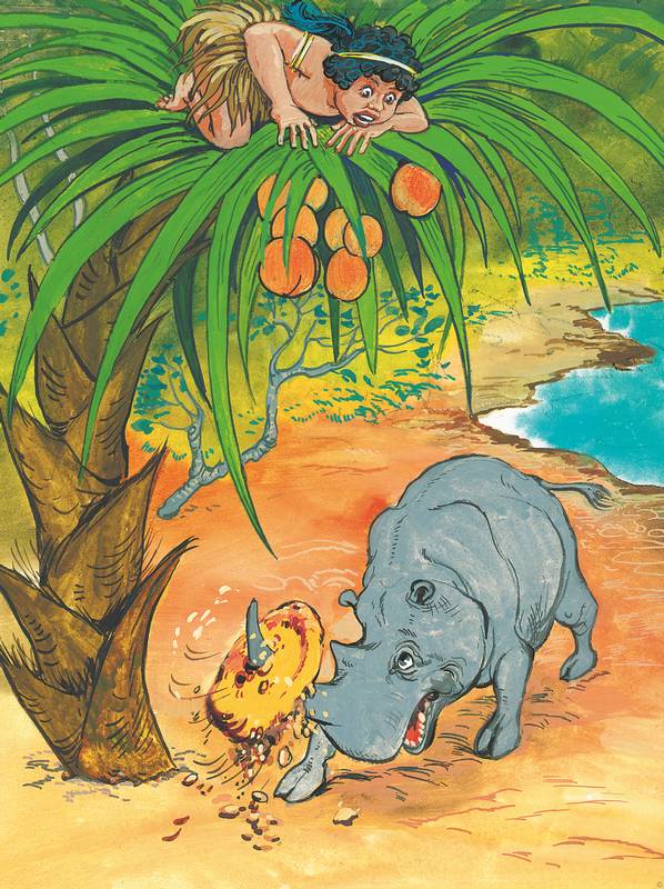 Парс увидел, что кожа носорога лежит на берегу, и засмеялся от радости. Он три раза проплясал вокруг неё, потирая руки. Затем он вернулся на свой бивуак и наполнил шляпу до краёв крошками пирога – парсы едят только пироги и никогда не подметают своего жилья. Он взял кожу носорога, хорошенько встряхнул её и насыпал в неё сколько мог сухих колючих крошек и пережжённых коринок. Затем он взобрался на вершину пальмы и принялся ждать, когда носорог вылезет из воды и станет надевать кожу.