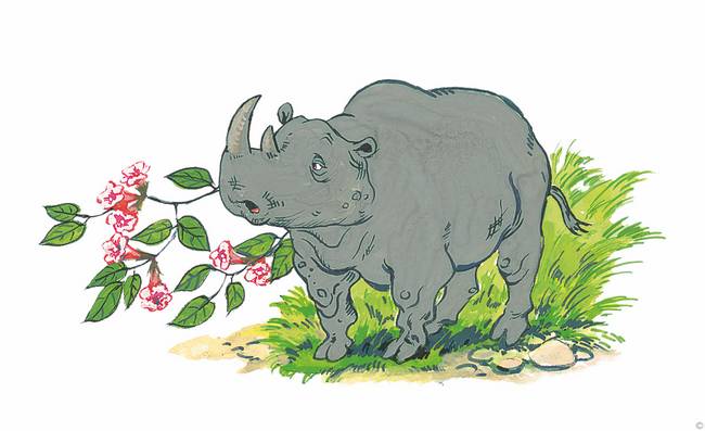 Носорог вылез, напялил кожу и застегнул её на все три пуговицы, но крошки страшно щекотали его. Он попробовал почесаться – вышло ещё хуже. Тогда он стал кататься по земле, а крошки щекотали всё больше и больше. Он вскочил, подбежал к пальме и принялся тереться об её ствол. Тёрся он до тех пор, пока кожа не сдвинулась крупными складками на его плечах, ногах и в том месте, где были пуговицы, которые от трения поотскакивали. Он страшно злился, но крошек удалить никак не мог, потому что они находились под кожей и не могли не щекотать его. Он ушёл в свои дебри, не переставая почёсываться. С того дня у каждого носорога бывают складки на коже и дурной характер, а всё из-за того, что у них остались под кожей крошки.