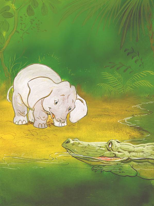 – Я получил новый нос от крокодила на берегу большой серо-зелёной мутной реки Лимпопо, – сказал слонёнок. – Я спросил, что у него бывает на обед, а он мне дал вот это.