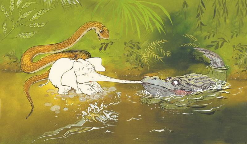 Он тянул, и слонёнок тянул, и крокодил тянул. Но слонёнок и двухцветный питон тянули сильнее. Наконец крокодил выпустил нос слонёнка с таким всплеском, который слышен был вдоль всей реки Лимпопо.