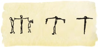 – Ну, давай рисовать остальные звуки, – сказал папа. Они целый день провели за делом, отрываясь только, чтобы позавтракать и немного побегать. Когда они дошли до звука т, то Таффи заявила, что с этого звука начинаются их имена – её, папино и мамино – и потому надо нарисовать семейную группу, где бы они все трое держались за руки. Это легко было нарисовать раз-другой, но когда пришлось повторить то же самое шесть-семь раз, то Таффи и папа справлялись всё хуже и хуже, и, наконец, от рисунка остался один высокий, худой Тегумай, протягивающий руки жене и дочери. На картинках видно, как это постепенно делалось.