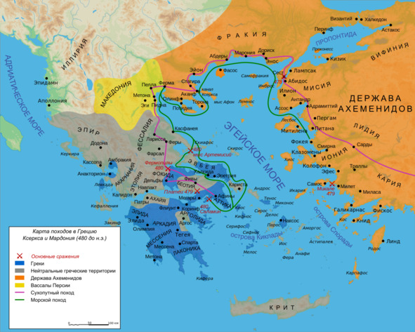 Македония (северная часть Балкан), до того, кстати, бывшая союзником Ксеркса, ставит свои гарнизоны по всем, пока еще суверенным полисам Греции, готовится к нападению на Персию.