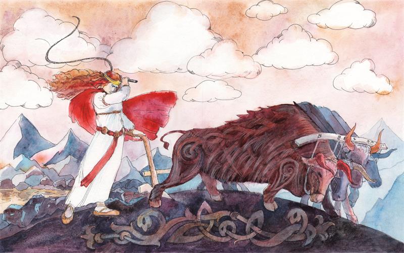 И вот взяла Гевьон четырех исполинских быков с севера, из Страны Ётунов, – надобно сказать, что это были ее сыновья от одного из великанов-ётунов, – и принялась пахать на них. Плуг так сильно и глубоко проникал в землю, что земля вся вздыбилась. И вот как об этом говорится в старых преданиях: