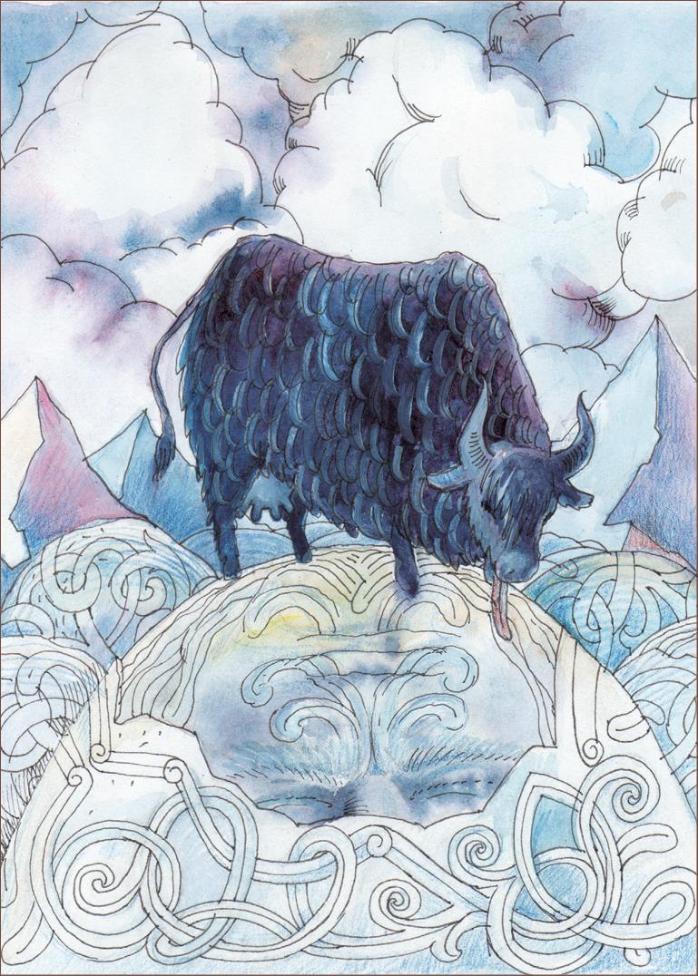 Чем же кормились они в этой Мировой Бездне? Одновременно с первыми исполинами из инея и льда народилась и исполинская корова, и имя ей было Аудумла. Первая великанская корова лизала ледяные глыбы, заполнявшие бездну, и из сосцов ее потекло молоко, которое и стало пищей для Имира и его инеистых исчадий.