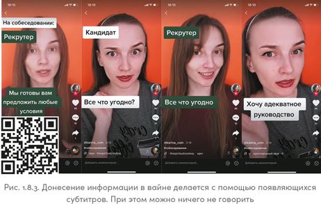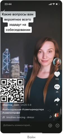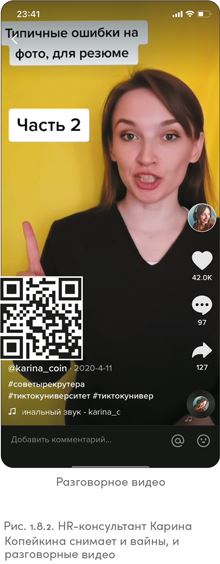 Девушку на рис. 1.8.2 зовут Карина Копейкина (@karina_coin). Карина – HR-консультант, в TikTok она делится секретами успешного трудоустройства. В своем аккаунте она использует оба вида: и вайны, и разговорные видео. Такой смешанный подход к контенту в TikTok часто встречается и у экспертов, и у брендов.