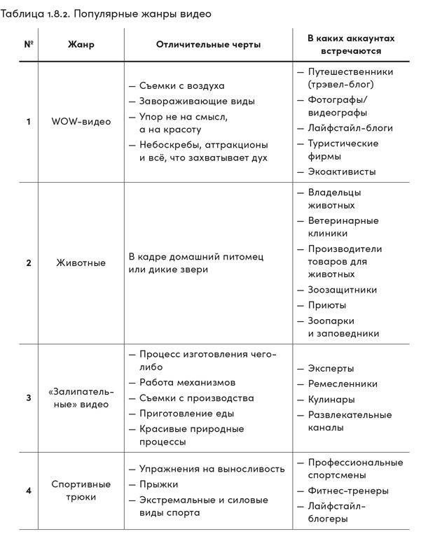 В таблице 1.8.2 приведены наиболее популярные жанры видео, которыми, однако, всё их разнообразие не ограничивается.