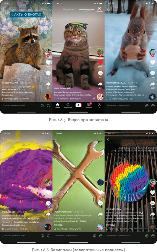 Посмотрите на рис. 1.8.2. Внешне вы можете не отличить один вид ролика от другого, поскольку не слышите звука. Но в большинстве случаев тиктокеры смотрят ролики именно с включенным звуком, чтобы слышать музыкальное сопровождение или речь.
