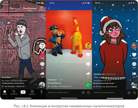 Большим успехом в TikTok пользуется и анимация. Такие ролики делают талантливые аниматоры-самородки: @tikshok, @morhunt и @mul_tik_tok (см. рис. 1.8.7 и 1.8.8), а также такие известные бренды, как, например, сервис доставки еды «Кухня на районе» (@local_kitchen) и Сбер (@sber_ru).