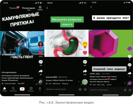 Заимствованные видео необязательно принадлежат другим авторам. Это могут быть и ваши собственные ролики, снятые для другой платформы, которые вы решили опубликовать в TikTok. Вы без труда узнаете заимствованный ролик: как правило, он горизонтального формата, поскольку изначально снимался не для TikTok (рис. 1.8.8).
