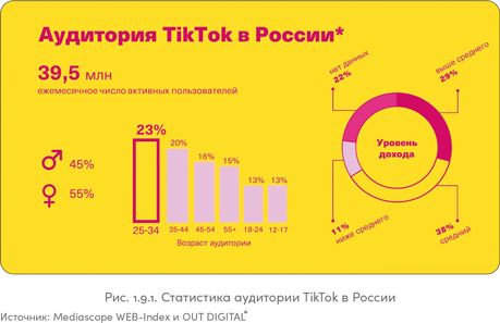 Конечно же, нас всех интересует наличие взрослой платежеспособной аудитории, и она тут широко представлена. Посмотрите на статистику TikTok в России (рис. 1.9.1). Четверть от аудитории в 39,5 млн человек составляют люди в возрасте 25–34 лет. И 29 % из них имеют доход выше среднего.