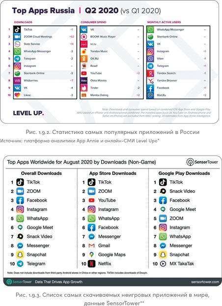 Согласно данным Level Up и App Annie на второй квартал 2020 года, TikTok занимает первое место по количеству скачиваний среди мобильных приложений в России, опережая WhatsApp, Instagram, «ВКонтакте» и «Госуслуги» (рис. 1.9.2).