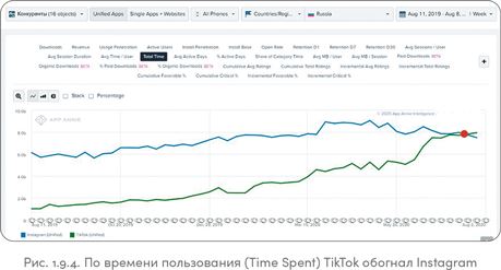 И последний аргумент в пользу того, что новая платформа с нами всерьез и надолго: недавно TikTok по общему времени пользования обогнал Instagram. На рис. 1.9.4 в точке, где пересекаются два графика (отмечено красным кружком), TikTok достигает значения 8 млрд минут в неделю, а Instagram, наоборот, падает ниже этой отметки. TikTok – зеленый график, Instagram – синий.