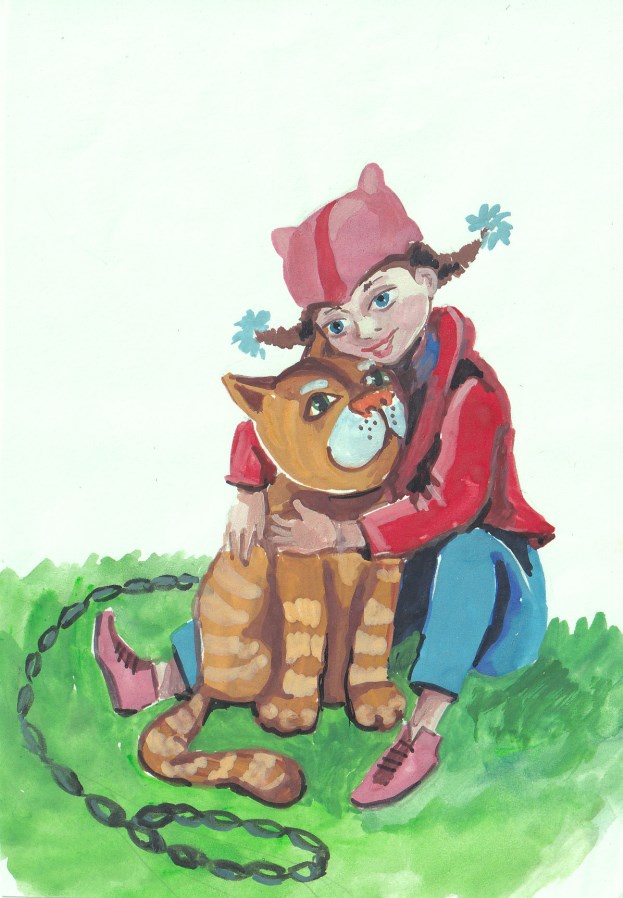 Когда я привожу сестрёнку в детсад, то перед тем как зайти в группу, она бежит на детскую площадку. Возле большого дерева сто-ит избушка на курьих ножках, а вокруг – разные сказочные фигурки – персонажи из сказок. Её интересует большой рыжий пластмассовый кот с цепью на шее, привязанной к дереву. Она садится на корточки, гладит его и причитает: