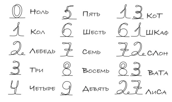 Итак: 0 – Н, 1 – К (кол), 2 – Л (лебедь), 3 – Т, 4 – Ч, 5 – П, 6 – Ш, 7 – С, 8 – В, 9 – Д.