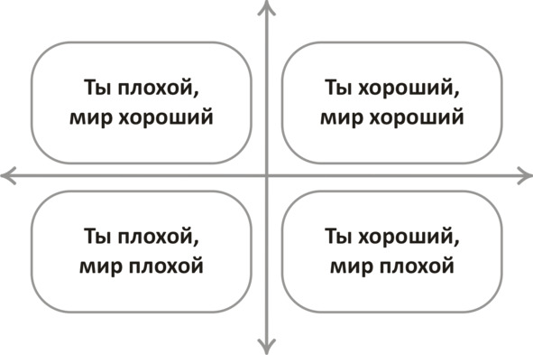 Существуют 4 модели воспитания: «Ты плохой, мир плохой», «Ты плохой, мир хороший», «Ты хороший, мир плохой», «Ты хороший, мир хороший».