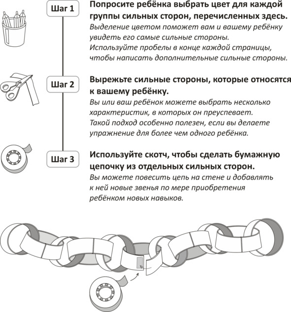 Так же из сильных сторон Вашего ребенка, которые Вы определите в предыдущем шаге, сделайте гирлянду, склеив ленточки друг с другом.