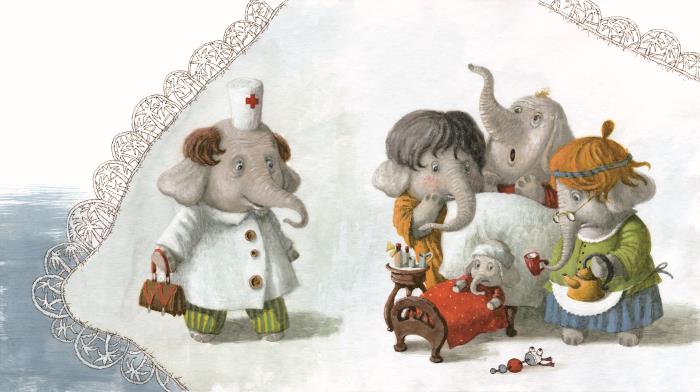 Семейство Слонов Перепугано насмерть — Слонёнок простужен, И кашель, и насморк. Лекарства достали, Компрессы готовы, Но где продаётсяПлаток хоботовый?Проводы
