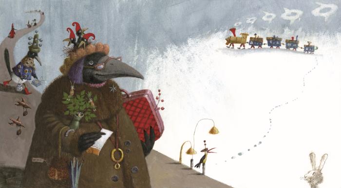 Спокойной походкойИдёт по перронуС большим чемоданомБольшая Ворона.А рядом с Вороной,Чуть дальше и сбоку,Её провожая,Шагает Сорока.И всё б это былоСовсем хорошо,Если б их поездДавно не ушёл.Послушный дождик