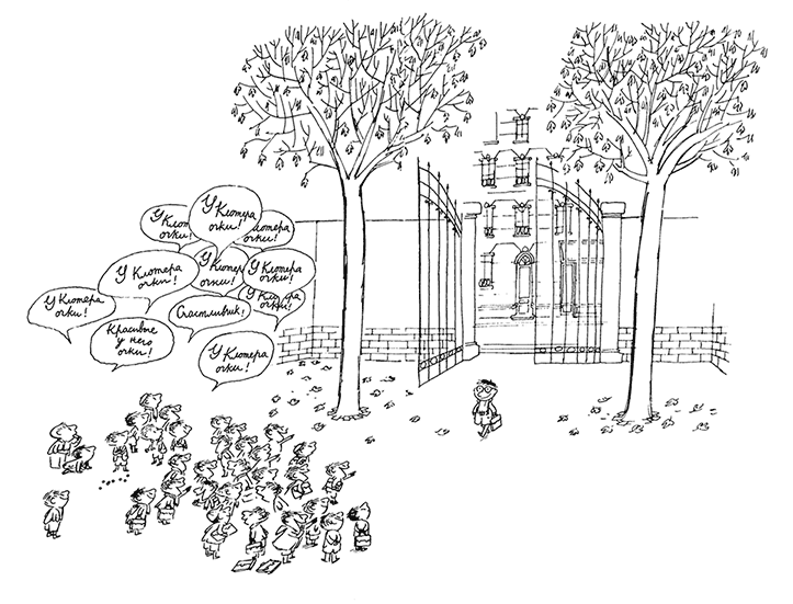 Когда сегодня утром Клотер пришёл в школу, мы все ужасно удивились, потому что у него на носу были очки. Клотер – хороший парень, но он в нашем классе самый отстающий, и, кажется, очки на него надели как раз из-за этого.