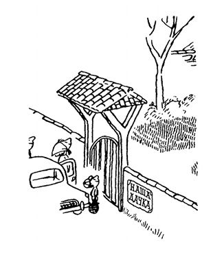 Мы, то есть папа, мама и я, выехали на машине довольно рано утром. Сначала папа пел, но потом перестал – всё из-за других машин, которые тоже ехали по дороге, и поэтому мы почти не двигались вперёд. Потом папа проехал светофор, у которого надо было повернуть налево, но сказал, что это не важно и что он выедет на нужную дорогу на следующем перекрёстке. Но на следующем перекрёстке шёл большой ремонт, там повесили табличку «Объезд», и мы потерялись. Папа кричал на маму, что она плохо читает ему объяснение, которое записано на бумажке, потом спрашивал дорогу у кучи разных людей, но никто из них ничего не знал, и мы приехали к мсье Бонгрену почти к обеду и сразу перестали ссориться.