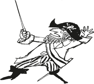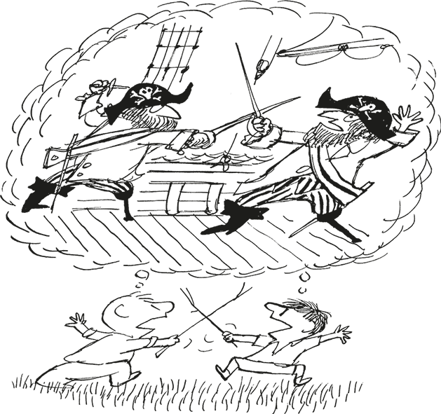 – Хорошо. Значит, я буду в чёрной шляпе с углами, длинной куртке, широком поясе, со шпагой и сапогами вот досюда. Ещё у меня будет длинная рыжая борода, а ты одевайся как хочешь, но у тебя тоже будет шпага – чак! чак! чак! – и ты захочешь взять мой корабль на абордаж, а я закричу своей верной команде: «Не вешать нос!» – и они уберут паруса. Пошли?