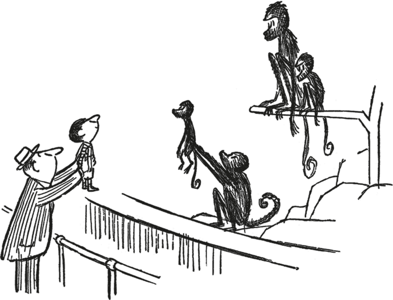 Первым делом мы пошли к обезьянам. Обезьяны прикольные, они делают смешные штуки и похожи на многих наших знакомых. Народу было полно, и папе пришлось брать нас на руки и поднимать. Если честно, папа поднимал только меня. Альцеста он попробовал поднять, но не смог. Нам хотелось посмотреть ещё что-нибудь, но папе очень понравились обезьяны. Вдруг Альцест заметил, что люди кидают обезьянам еду, и тоже захотел. Папа купил печенье и дал Альцесту, чтобы тот кормил обезьян. Но Альцест не стал их кормить. Когда папа спросил почему, Альцест ответил, что подумал и решил, что лучше сам съест печенье, чем отдаст его каким-то незнакомым обезьянам.