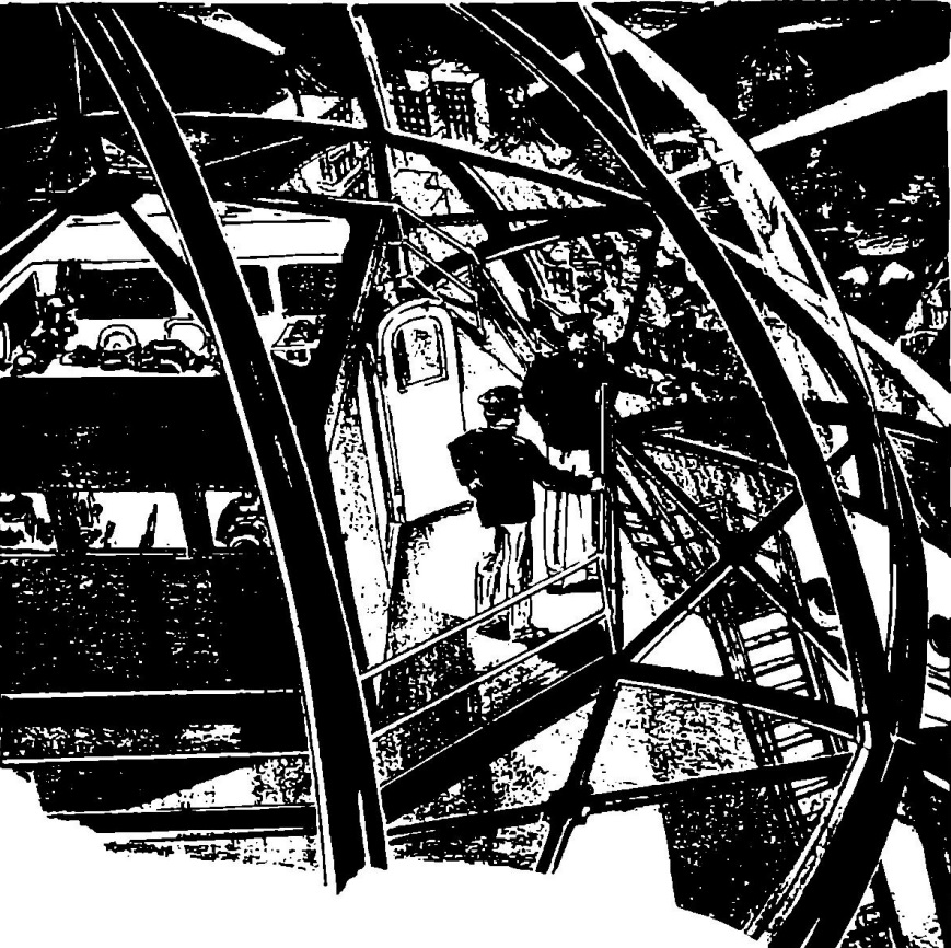 Над надстройкой, словно металлическая сеть, вились многочисленные мостики, лестницы и балконы. Башня, в которой мы с доктором Фрэнком стояли сейчас, находилась именно здесь. В пятидесяти футах от нее, словно птичье гнездо, прилепилась к металлическому мостику приборная комната Снапа. Куполообразная крыша, с загнутыми назад стеклопакетами, возвышалась в виде кургана и закрывала самую высокую среднюю часть судна.