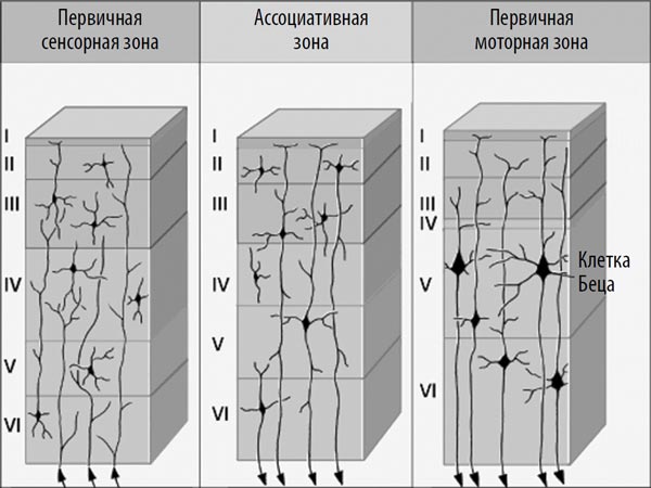Эта тонкая структура мозга состоит из шести основных слоев – от слоя I (внешний) до слоя VI. Аксоны (выходные контакты), отходящие от нервных клеток на уровне слоев II и III, проецируются в другие участки новой коры. Аксоны, отходящие от слоев V и VI, вне новой коры связываются с таламусом, стволом мозга и спинным мозгом. Нейроны слоя IV принимают синаптические (входные) сигналы от нейронов, находящихся вне новой коры, особенно в таламусе. В разных отделах мозга число слоев коры может незначительно изменяться. В моторной коре слой IV очень тонкий, поскольку в этой зоне он практически не принимает сигналов от таламуса, ствола мозга или спинного мозга. Напротив, в затылочной доле (зоне новой коры, ответственной за зрение) слой IV имеет три дополнительных подслоя, поскольку в эту область приходит множество сигналов, в том числе от таламуса.
