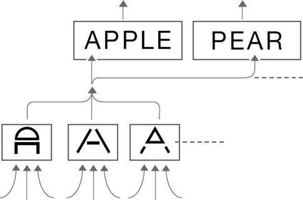 Третий и последний элемент образа – это набор образов более высокого порядка, в состав которых он входит. Для буквы «А» это все слова с буквой «А». Здесь вновь уместно сравнение с веб-страницей. Каждый распознанный образ более низкого порядка запускает распознавание образа более высокого порядка, содержащего первый образ. В новой коре эти связи осуществляются дендритами, соединяющимися с нейронами в каждом распознающем модуле коры. Помним, что каждый нейрон может получать сигналы от множества дендритов, но выдает единственный сигнал на аксон. Этот аксон, однако, может, в свою очередь, передавать сигнал множеству дендритов.