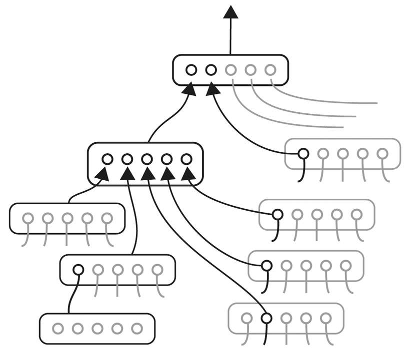 Модуль самого нижнего уровня, который получает сигналы непосредственно от органов чувств, может быть обучен распознавать определенную форму линии. Более высокие уровни обрабатывают информацию, поступающую от низших, учитывая контекст и повышая уровень абстрагирования. Таким образом, модули, расположенные все дальше от органов чувств, узнают в изогнутой линии часть буквы, воспринимают ее как часть слова и связывают это слово с определенным понятием. На самом высоком уровне обрабатываются максимально абстрактные концепции, например, было ли высказывание забавной шуткой или же в нем содержался сарказм.