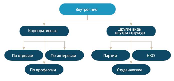 Однако к внутренним сообществам относятся не только корпоративные комьюнити. Есть и другие виды организаций, внутри которых можно выделить группы людей как сообщества.