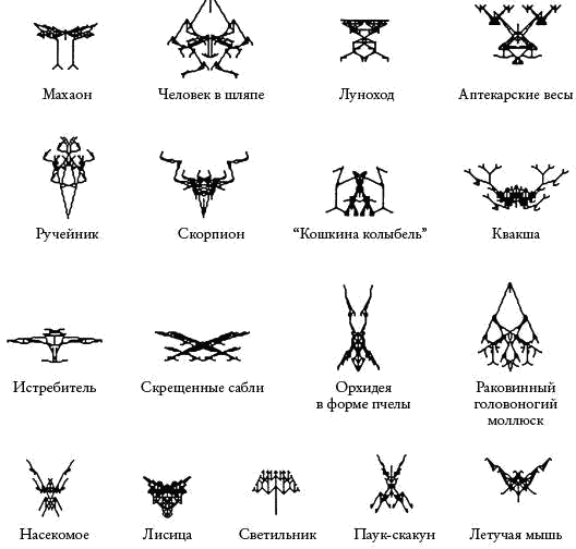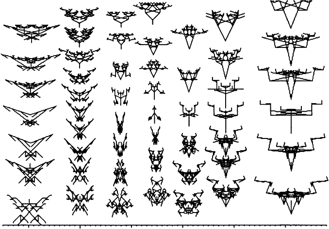 Компьютерные модели с биоморфами очень показательны в этом отношении – они как бы перекидывают мостик между человеческим творчеством и эволюционной созидательностью естественного отбора, “слепого часовщика”. Чтобы это увидеть, следует подробнее развить мысль о Стране биоморф как о “математическом пространстве” – нескончаемом, но упорядоченном скоплении морфологических разновидностей, где каждое существо сидит на надлежащем месте, дожидаясь, когда его обнаружат. Семнадцать созданий, изображенных на рис. 5, расположены там без какого-либо порядка. Но в Стране биоморф каждое из них занимает свою собственную, уникальную позицию, определяемую имеющимся у него набором генов, и находится в окружении собственных, себе лишь свойственных соседей. Все существа, населяющие Страну биоморф, расположены друг относительно друга в пространстве строго определенным образом. Что это означает? Какой смысл в их пространственное расположение мы вкладываем?