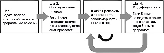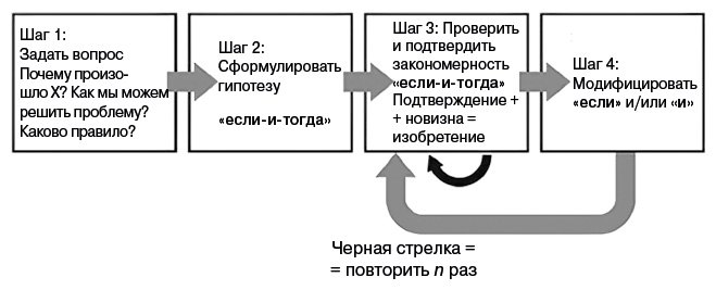 Шаг 3 – это проверка закономерности «если-и-тогда» в цикле. Мы делаем это в ходе повторяющихся экспериментов или наблюдений, чтобы проверить, всегда ли она верна. Когда мы проверяем закономерность, этот шаг повторяется снова и снова, позволяя нам убедиться в том, что каждый раз мы получаем одни и те же результаты. (Цикл обозначен маленькой черной стрелкой под шагом 3 на илл. 2.1.) Лучшие систематизаторы повторяют этот цикл десятки или даже сотни раз, чтобы убедиться в том, что закономерность «если-и-тогда» верна. Если она подтверждается и выявлена впервые, то мы имеем дело с изобретением.