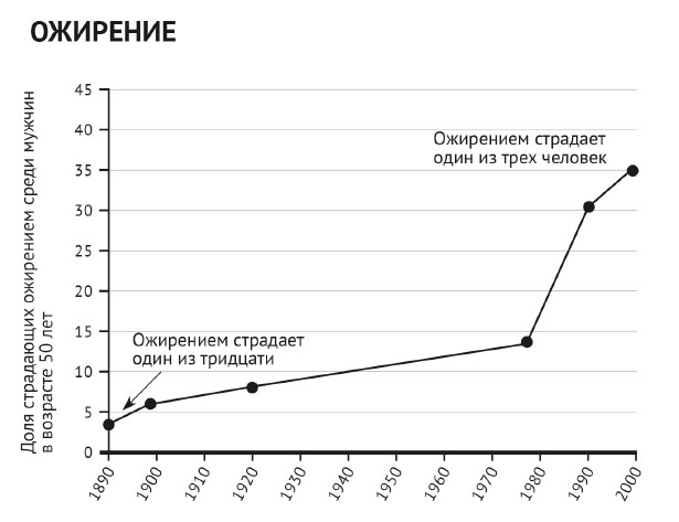 В 1890 г. ожирением – если использовать современные критерии – страдали лишь 3 % взрослых американцев, а сахарный диабет обнаруживался у двух-трех человек на сто тысяч населения. Артериальная гипертония обнаруживалась менее чем у 5 % американцев моложе 65 лет, а относительно поражения коронарных артерий существовали только догадки о том, что оно является причиной давящей боли в груди, характерной для стенокардии. Все кардинально изменилось за прошедшие сто лет.