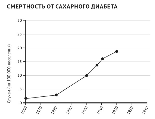 Наблюдения, согласно которым заболеваемость ожирением, сахарным диабетом, артериальной гипертонией и ишемической болезнью сердца одновременно резко увеличилась в 1890-е гг., поставили перед учеными и врачами вопрос о том, не существует ли какой-то один общий фактор, вызывающий все эти болезни. Что такого особенного было в тех годах позапрошлого века, что привело к увеличению заболеваемости ожирением и связанными с ним болезнями? Было ли это небывалое усовершенствование техники, которое изменило наш образ жизни? Не были ли причиной изменения в экономике или специфические изменения в питании? Позже мы вернемся к тому времени, чтобы исследовать первопричину. Пока же можно сказать, что в то время ни врачи, ни общество не имели ни малейшего представления о том, что ждало всех за ближайшим углом.