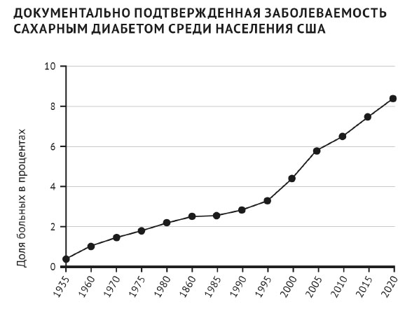 Сегодня ожирение характерно для 30–40 % населения США, а 10–12 % страдают сахарным диабетом. В некоторых регионах мира, например, в Самоа, диабетом болеют от 40 до 50 % взрослого населения. Точно так же повышенное артериальное давление поражает треть взрослого населения, а сердечно-сосудистые заболевания являются причиной смерти номер 1 в США. Практически у всех есть родственники или друзья с каким-либо из этих заболеваний.