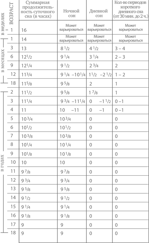 Одна из наименее очевидных проблем – это недосыпание. По одной только продолжительности суточного сна невозможно судить, высыпается ли конкретный ребенок. В таблице ниже приведены данные о потребности детей в дневном и ночном сне. Большинство малышей более-менее вписываются в эти данные с отклонениями в пределах часа. В течение первых месяцев жизни общая продолжительность суточного сна быстро снижается до 11–12 часов. Дальнейшее снижение идет значительно медленней. Дети на удивление «единодушны» в отношении общей продолжительности сна, хотя могут по-разному распределять часы своего отдыха. Если один девятимесячный малыш может спать девять часов ночью и два раза по полтора часа днем, то другой после 12-часового ночного сна в дневное время лишь ненадолго прикорнет.