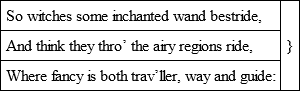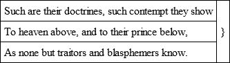 ‘Let meaner spirits stoop to low precarious fame,Content on gross and coarse applause to liveAnd what the dull and senseless rabble give;Thou didst it still with noble scorn contemn,Nor wouldst that wretched alms receive,The poor subsistence of some bankrupt, sordid name:Thine was no empty vapour, raised beneath,And formed of common breath,The false and foolish fire, that’s whisked aboutBy popular air, and glares awhile, and then goes out;But ’twas a solid, whole, and perfect globe of light,That shone all over, was all over bright,And dared all sullying clouds, and feared no darkening night.’Oldham’s principal celebrity, however, is derived from his satires. He had the knack of stinging invective, and has been not unjustly compared to Churchill. His Satires on the Jesuits exactly suited the time of the Popish Plot, at present they repel by their one-sidedness. All satire, except that inspired by fancy, is apt to become repulsive by its natural tendency to dwell upon the meanest and lowest aspects of human nature; and this is pre-eminently the case with Oldham, who is always ridiculing or denouncing, always drawing his illustrations from the base and offensive, and seldom diversifies his low matter with an ennobling thought. Yet he evinces so much manly sense, and his style is so nervous, that it is impossible not to admire his vigour, and wish him a more inviting subject. His metre and rhyme frequently stand in need of Dryden’s generous apology:
