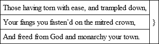 ‘O early ripe! to thy abundant storeWhat could advancing age have added more?It might, what Nature never gives the young,Have taught the smoothness of thy native tongue.But satire needs not these, and wit will shineThrough the harsh cadence of a rugged line.’All this notwithstanding, Oldham had the root of the matter in him, and has described, as only a poet could, the ambition, the toil, and the triumph of a poet: