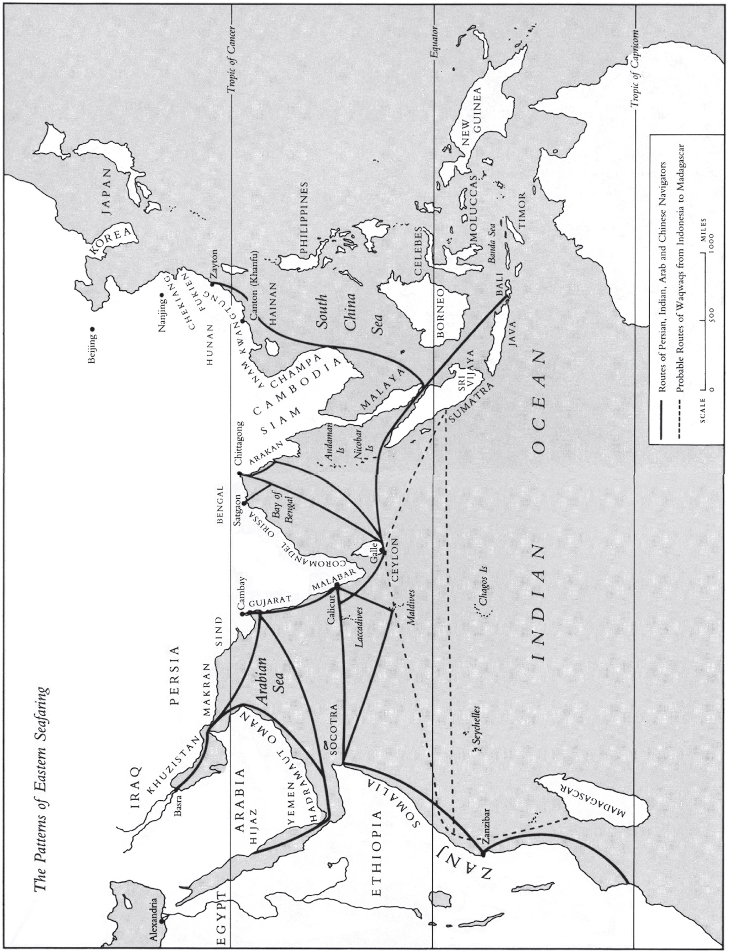 Where versions of names converted from non-roman scripts are widely recognized, they are adhered to: for instance, the spelling Mecca is used rather than Makkah, even though the latter is more exact. Likewise, the renowned sultan of Zanzibar in the second half of the nineteenth century should strictly be entitled al-Sayyid Sa’id, but his name was always ‘Europeanised’ as Seyyid Said. For other transliterations from Arabic the Encyclopaedia of Islam is generally followed, but without diacritical marks. With Chinese names the modern pinyin romanization has been adopted – so that the admiral formerly known in English as Cheng Ho appears as Zheng He. Most prefixes to root words in African languages are omitted for simplicity’s sake.