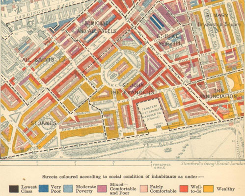The use of the aerial panorama was even encouraged as a tool of sociological investigation. By studying the city from above, with the objective ‘angel’s eye’, it was possible to reveal much about its social structure, its balance of commercial and private dwellings, and especially (as both Poole and Mayhew had remarked) its savage contrasts of rich and poor. One indirect result of this was the famous ‘poverty maps’ compiled by the philanthropist Charles Booth in the 1880s.