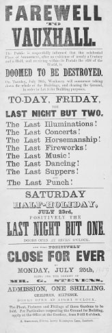 Vauxhall Gardens finally closed after its ‘Last Night for Ever’ on 26 July 1859. Many reasons were given for this. The proprietors blamed the magistrates who continually banned their most popular attractions as either too dangerous, or too disruptive to the newly respectable neighbourhood of Kennington. Ballooning and fireworks displays were particularly blamed for this. But other factors certainly played a part: the gardens had become run-down and tawdry, and were considered old-fashioned; the railway, which ran past the main entrance, had made travel further afield much easier and cheaper; seaside towns, with their Vauxhall-like piers, were becoming fashionable; and, finally, the site itself was too valuable as property, and the blandishments of developers eventually persuaded the proprietors to sell up.9