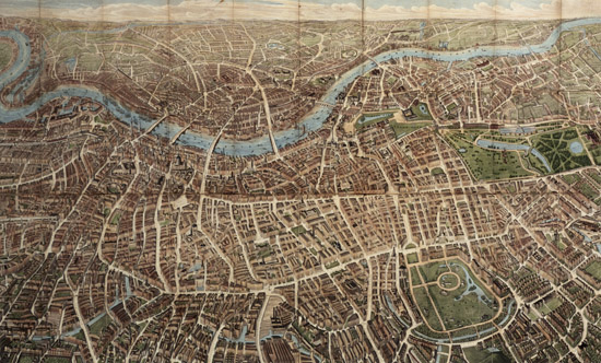 Another, more commercial, use of the panoramic ‘airborne’ view was to develop a new kind of tourist’s or visitor’s guide to the great cities. These were particularly successful with the main landmarks and thoroughfares of London and Paris. They invited the newcomer to overfly the great metropolis in imagination, to float calmly above its streets and squares, and to link one district with another. Thus journeys could be planned in a new way, and the visitor could achieve a new kind of ‘orientation’. They may even have helped people to think about the layout of big cities in a different way, no longer as a series of fixed localities or distinct villages, but as a flowing, dynamic urban environment actively linked by a moving network of cabs, horse-drawn omnibuses and trams; and later by underground railways and motor cars. Indeed, the first section of the London Underground (part of the Metropolitan and City Line) opened as early as 1863.