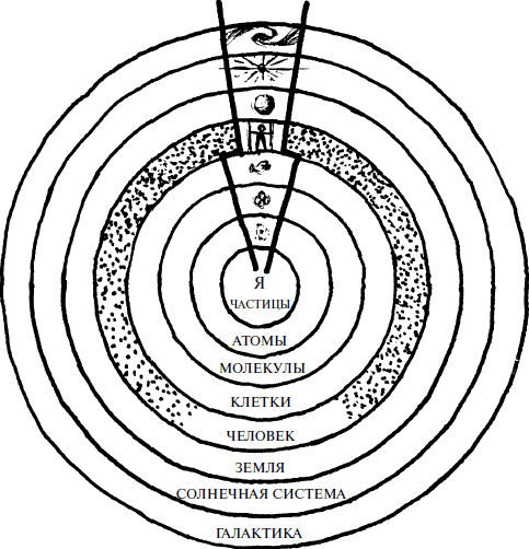У тебя тоже есть слои. На расстоянии нескольких метров ты – человек. Но если я приближусь, ты станешь сначала одной головой, затем глазом, а после – размытым пятном. Приближаясь еще, я прохожу сквозь твои молекулярные и атомарные уровни, снимая с тебя видимости до тех пор, пока от тебя практически ничего не остается. С другой стороны, если я удаляюсь, твое тело растворяется в окружающей среде – маленьком или, быть может, большом городе, который затем замещается твоей страной и континентом. Отдаляясь еще больше, я прохожу сквозь твой планетарный, солнечный и галактический уровни. Эти уровни также являются тобой – когда ты воспринимаем с огромных расстояний – несмотря на то что обычно ты не думаешь о них как о «себе». Но ты зависишь от этих удаленных уровней настолько же, насколько от более близких. К примеру, твое солнце так же необходимо для твоей жизни, как и твое сердце.