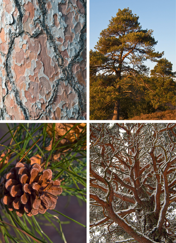 A conical evergreen when young and growing vigorously, up to 36 m (118 ft), becoming much more open, and flat-topped with a long bole, when older. Red- or grey-brown bark low down on the trunk, but markedly red or orange higher up in mature trees. Irregular branches, with needles in bunches of two, grey-green or blue-green, up to 7 cm (2½ inches) long. Native to Scotland, and originally much of Britain, as well as much of Europe and Asia.