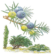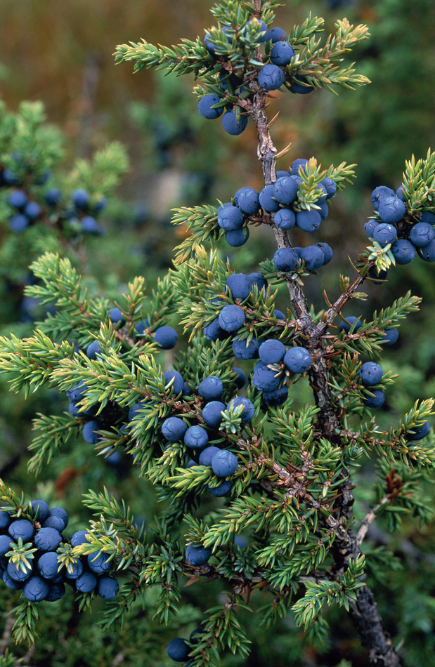 Locally common on chalk downs, limestone hills, heaths and moors, chiefly in southeast England and the north. A shrub 1.5–3.5 m (4–12 ft) high – though there is also a prostrate form – with whorls of narrow evergreen leaves. Flowers, small, yellow, at the base of the leaves, appear in May and June. The fruit is a green berry-like cone, appearing in June but not ripening until September or October of its second year, when it turns blue-black.